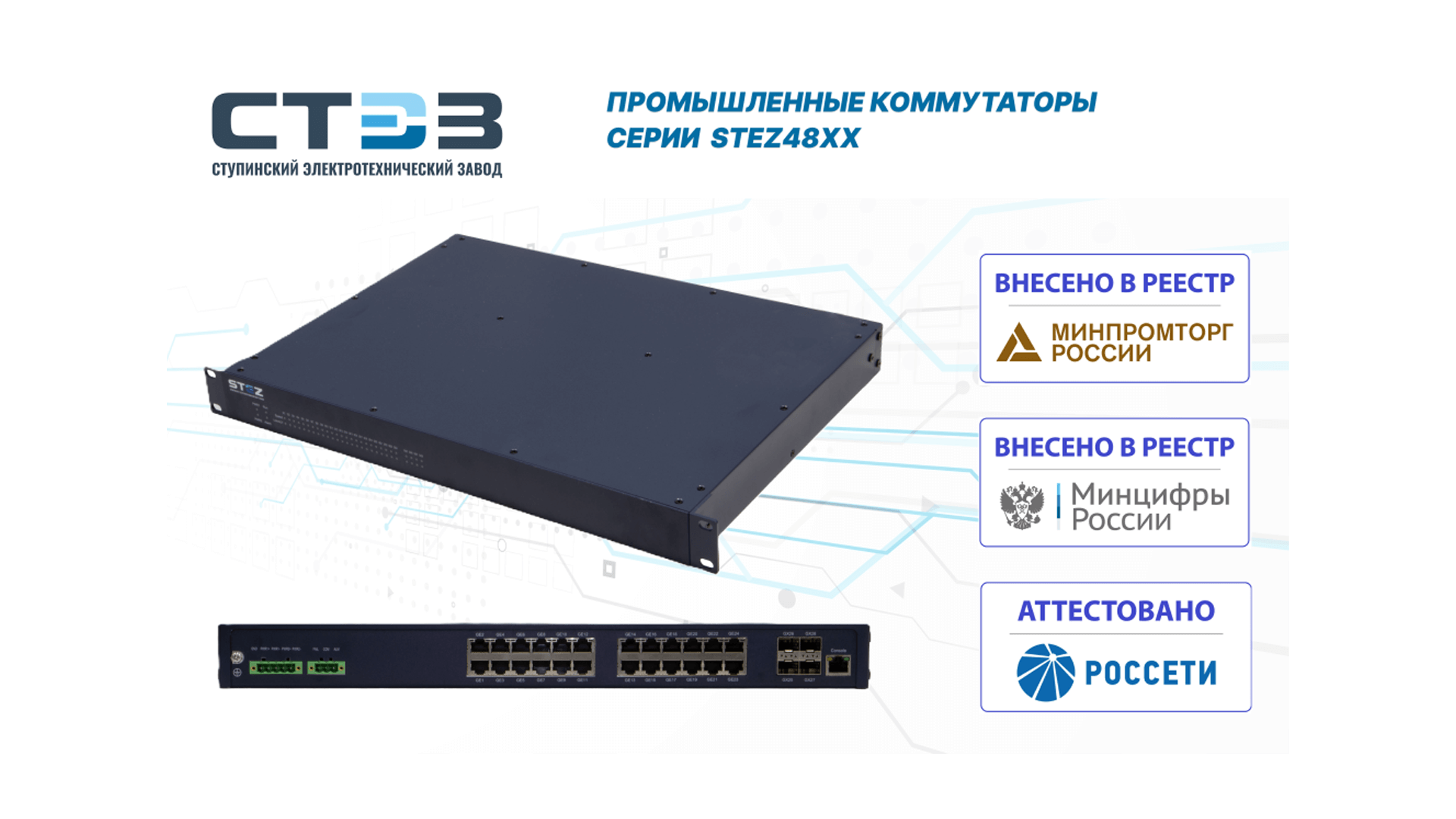 - Серия коммутаторов STEZ48xx успешно прошла все процедуры оценки соответствия и включена в Реестр промышленной продукции Минпромторга РФ.