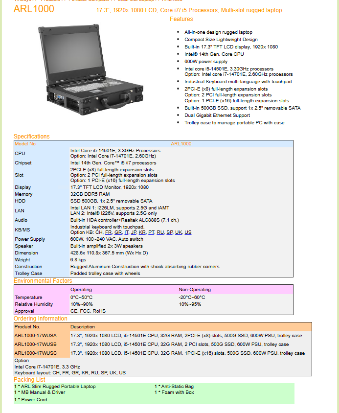 Портативный ноутбук 17.3" TFT LCD, 1920x1080, Intel i5-14501E, 32Гб RAM, 500Гб 2.5" SSD, DVD/RW, DVI-D/HDMI/DP, 2xGbit LAN, 2xCOM, 6xUSB 3.0, Audio, 2xPCIe x8, блок питания 400Вт, транспортировочный кейс