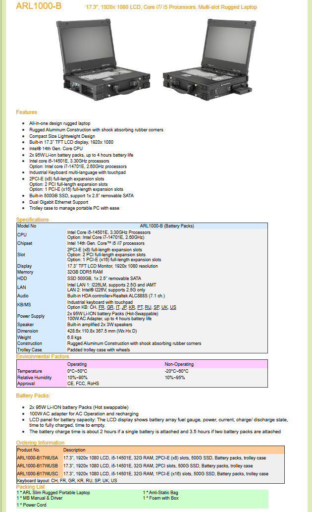 Промышленный ноутбук, 17.3" TFT LCD, 1920x1080, Intel Core i5-14501E, 32Гб DDR5 RAM, 500Гб SSD, 2x2.5GbE LAN, Audio, клавиатура, тачпад, динамики, 2xPCIe x8, с аккумуляторами, сумка