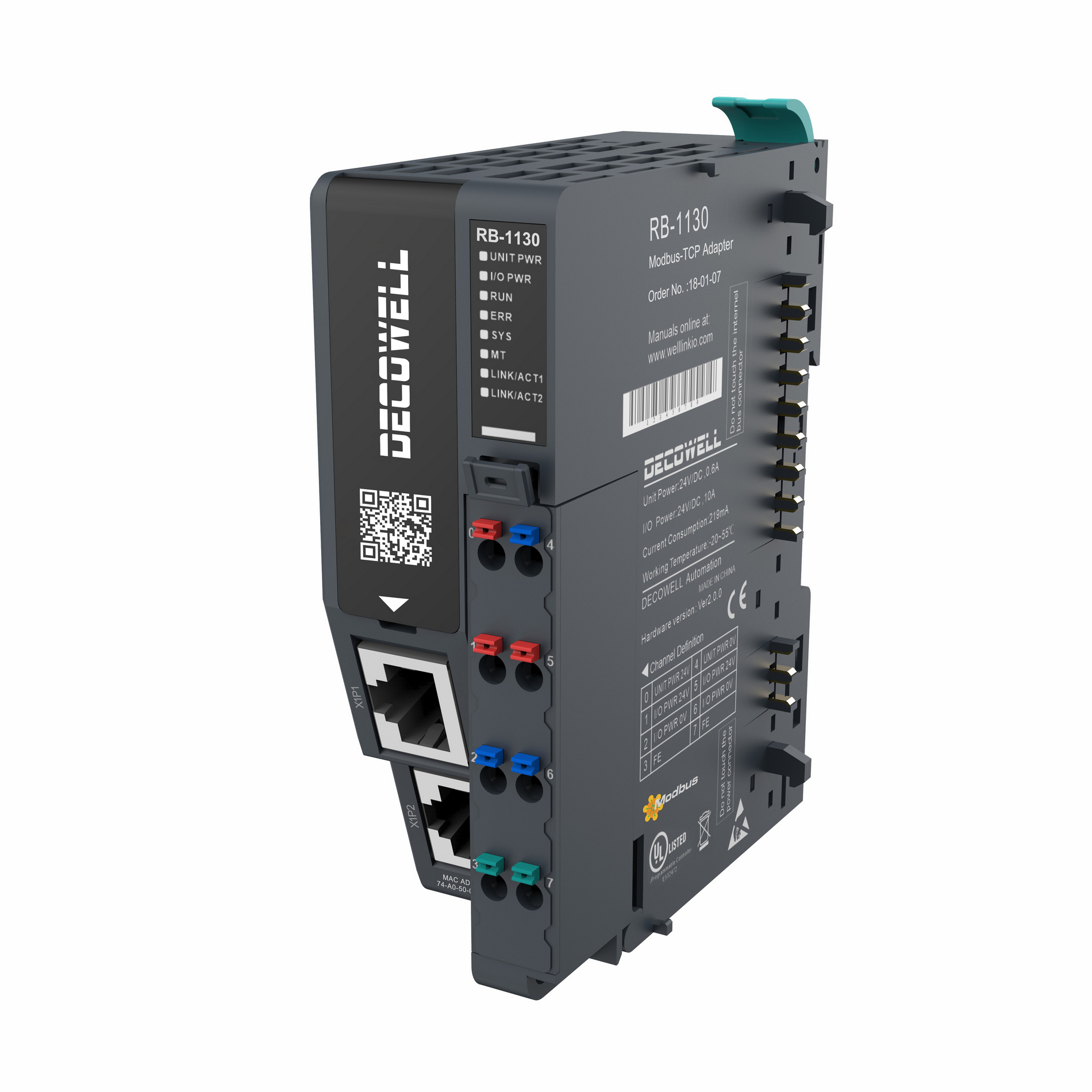 Головной коммуникационный модуль для подключения модулей ввода/вывода серии RB, 2xEthernet, Modbus TCP